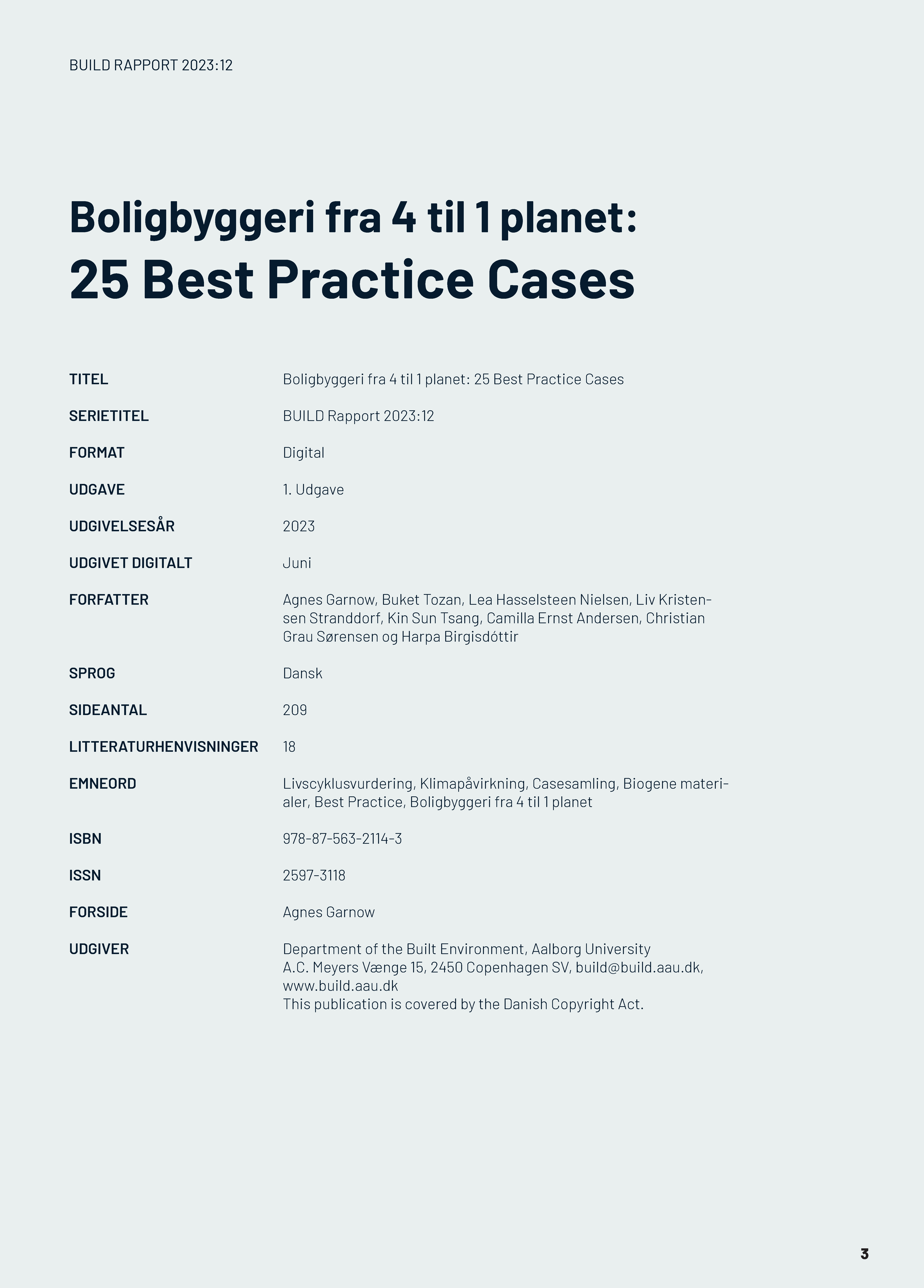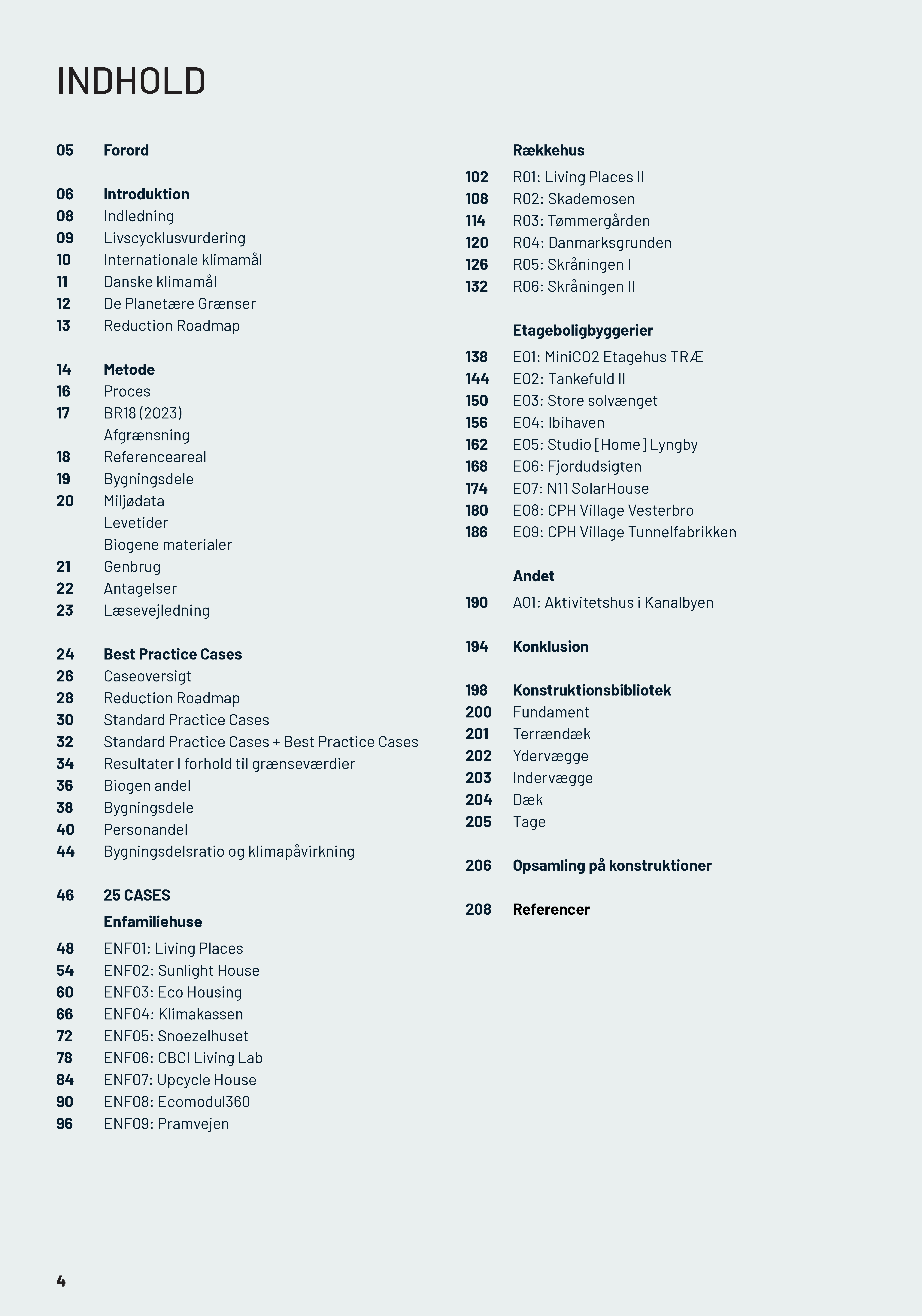 Nærværende publikation præsenterer som noget nyt, en casesamling af best practice byggeri, som demonstrerer mindre traditionelle byggepraksisser, der kan resultere i lavere klimaftryk over bygningens livscyklus sammenlignet med konventionelt boligbyggeri. Formålet med casesamlingen er at fungere som et opslagsværk der kan inspirere dem, som ønsker at bygge boligbyggeri med lavere klimaaftryk. Casesamlingen inkluderer 25 boligbyggerier, herunder 7 enfamiliehuse, 2 sommerhuse, 6 rækkehuse, 9 etageboliger, heraf 3 studieboliger og 1 andet byggeri. Dette er et fælleshus som inkluderes i casesamlingen grundet dets eksperimenterende tilgang til nybyggeri i bl.a. beton.