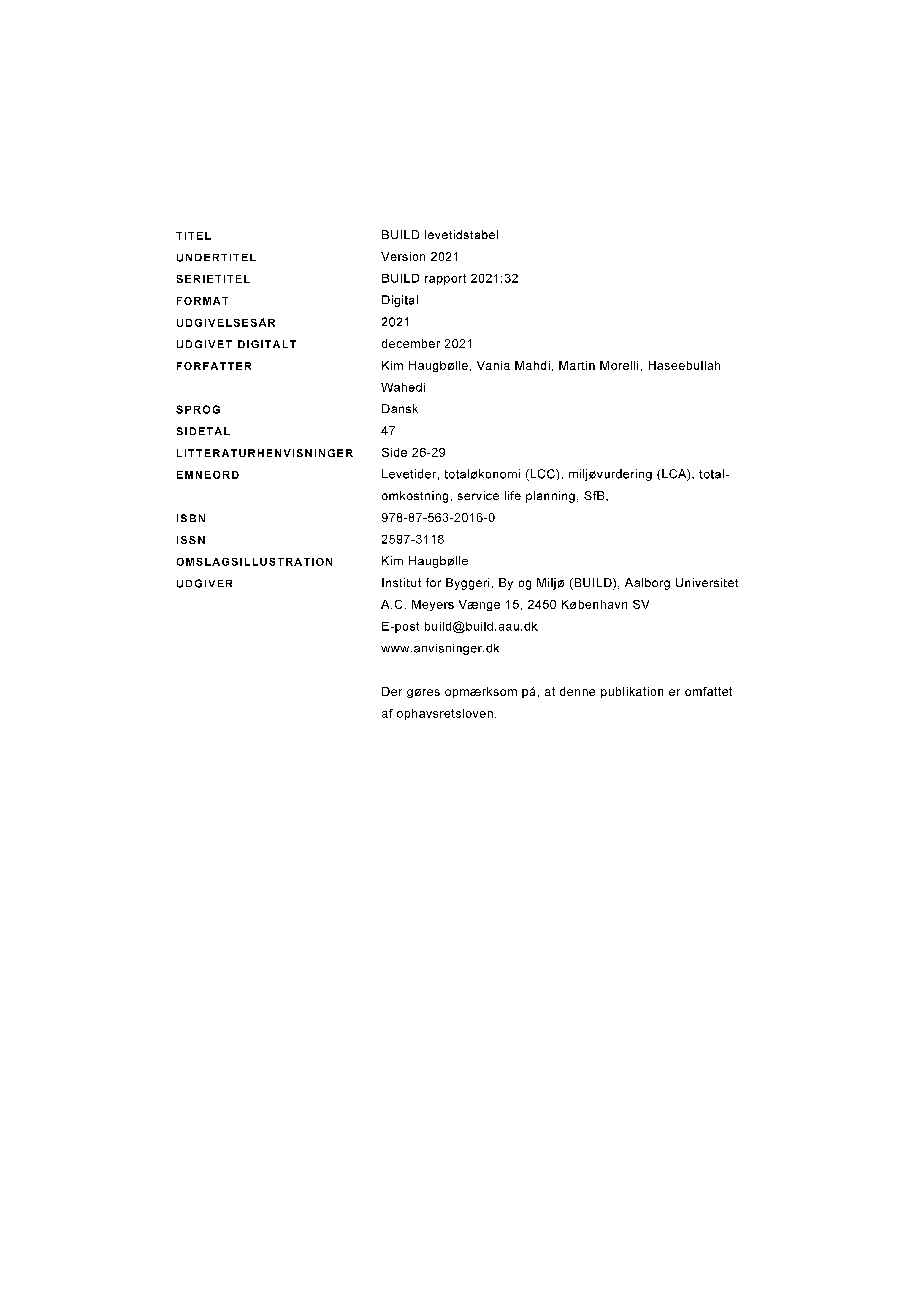 For at styrke udbredelsen af LCA og LCC og skabe grundlag for så retvisende beregninger som muligt er det afgørende, at der er pålidelige, let tilgængelige og bredt anerkendte levetider tilgængelige for brugere af fx værktøjerne LCCbyg og LCAbyg i form af en levetidstabel fra en uvildig institution. Formålet med dette projekt er at tilvejebringe en ny levetidstabel, som opdaterer og udvider den hidtidige levetidstabel fra SBi2013:30. Den ny levetidstabel udvides til fire forskellige detaljeringsniveauer, som kan dække en stigende detaljeringsgrad gennem byggeprocessens faser. De fire levetidstabeller omfatter: