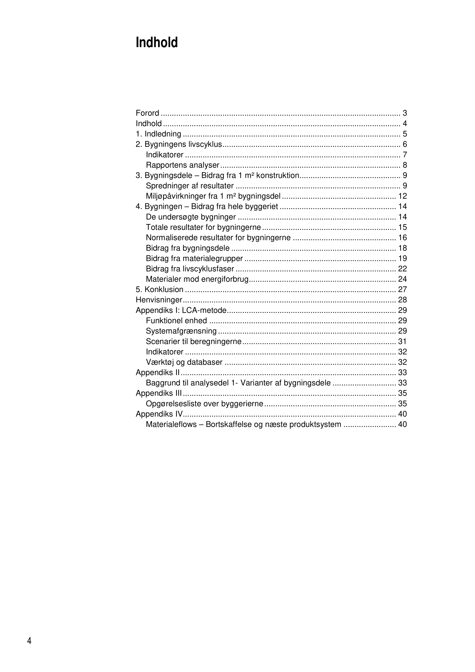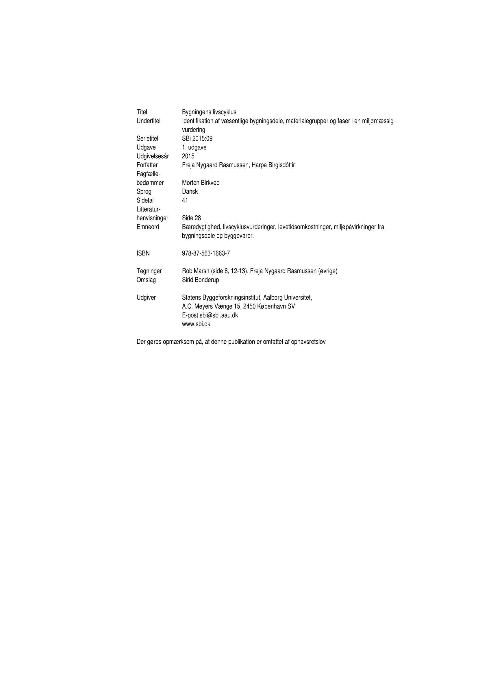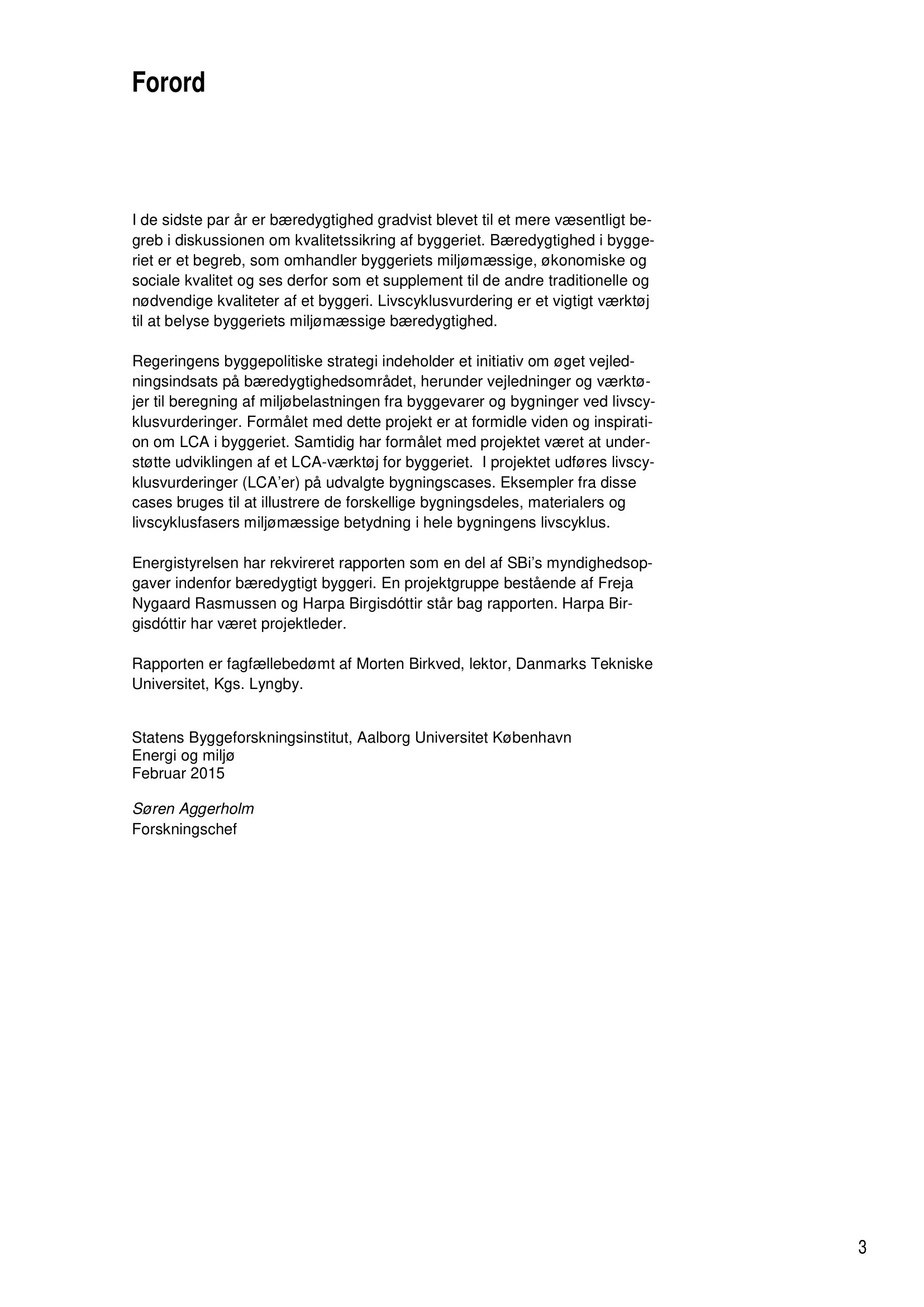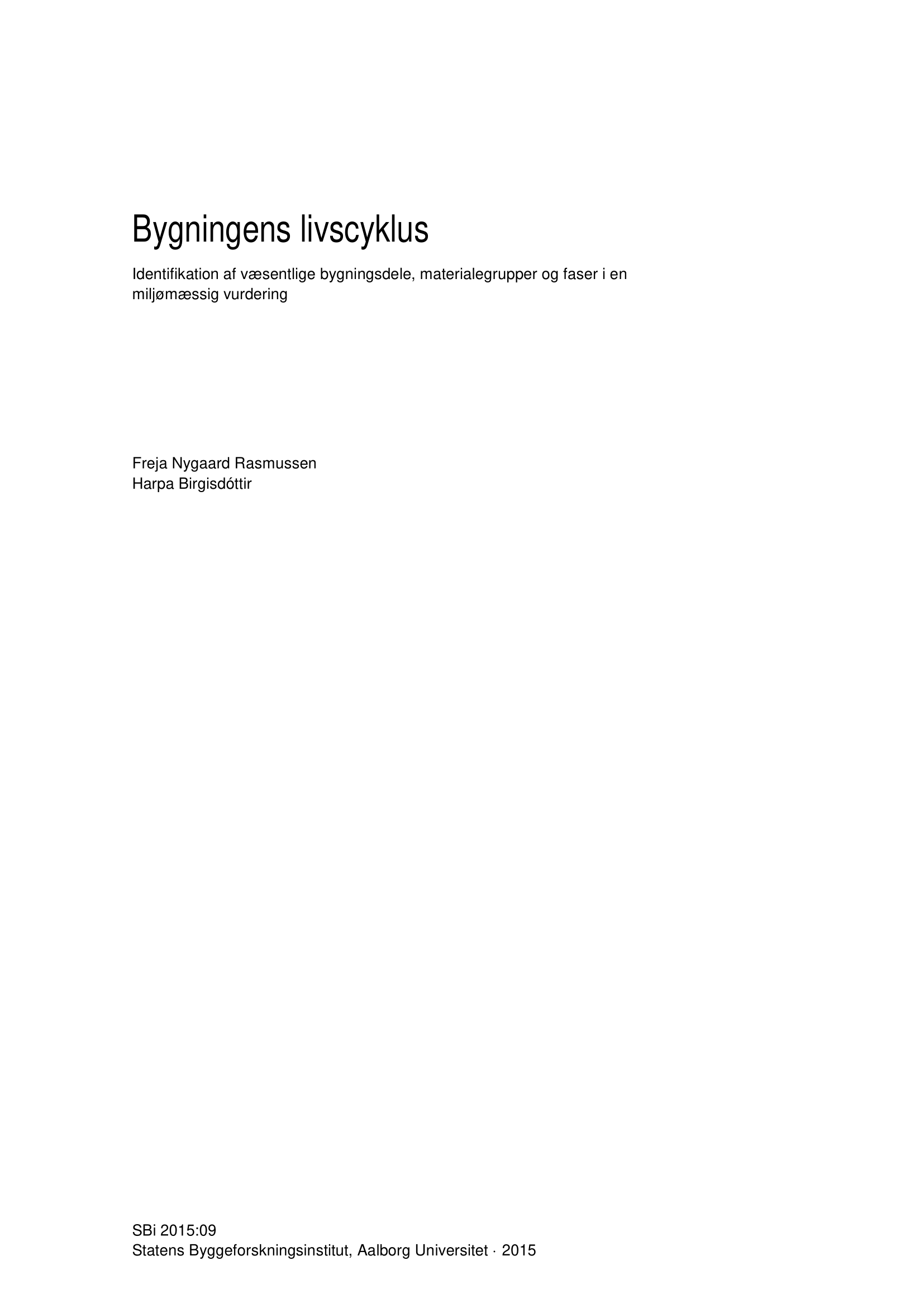 Livscyklusvurderinger bruges i stigende grad som et værktøj til at klarlægge et byggeris miljømæssige bæredygtighed over bygningens samlede levetid. I denne rapport bruges metoden til at analysere både en række varianter af de almindeligste bygningsdele samt eksempler på typiske danske parcelhus- og kontorbyggerier med forskellige energiprofiler. Hermed får byggeriets parter et opdateret vidensgrundlag til at vurdere forskellige byggevarer og bygningsdeles væsentlighed for et byggeris samlede miljøpåvirkning og ressourceforbrug.