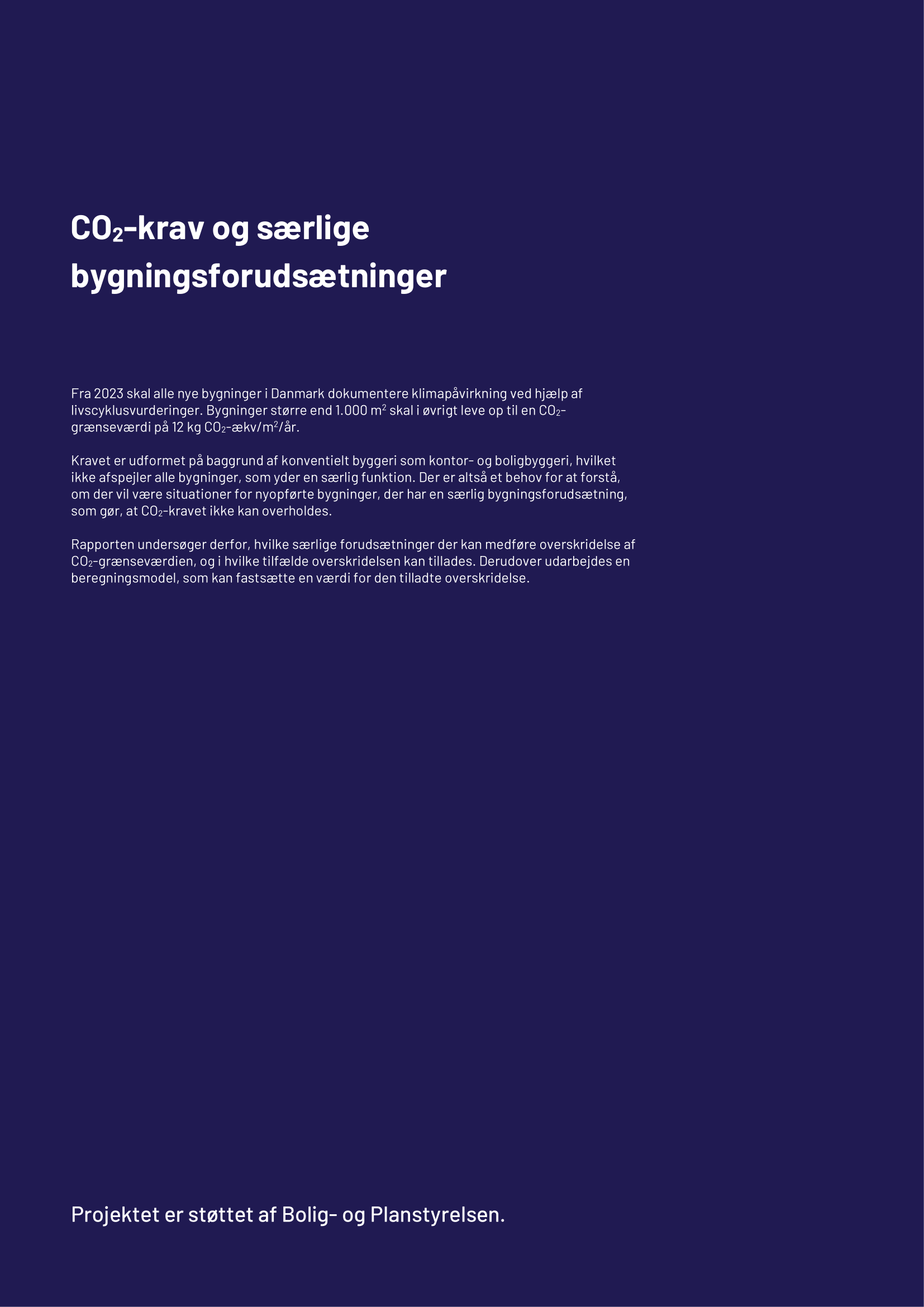 Rapporten undersøger, hvilke særlige bygningsforudsætninger der kan medføre en overskridelse af CO2-grænseværdien, og i hvilke tilfælde overskridelsen kan tillades. Derudover udarbejdes en beregningsmodel, som kan fastsætte en værdi for den tilladte overskridelse.