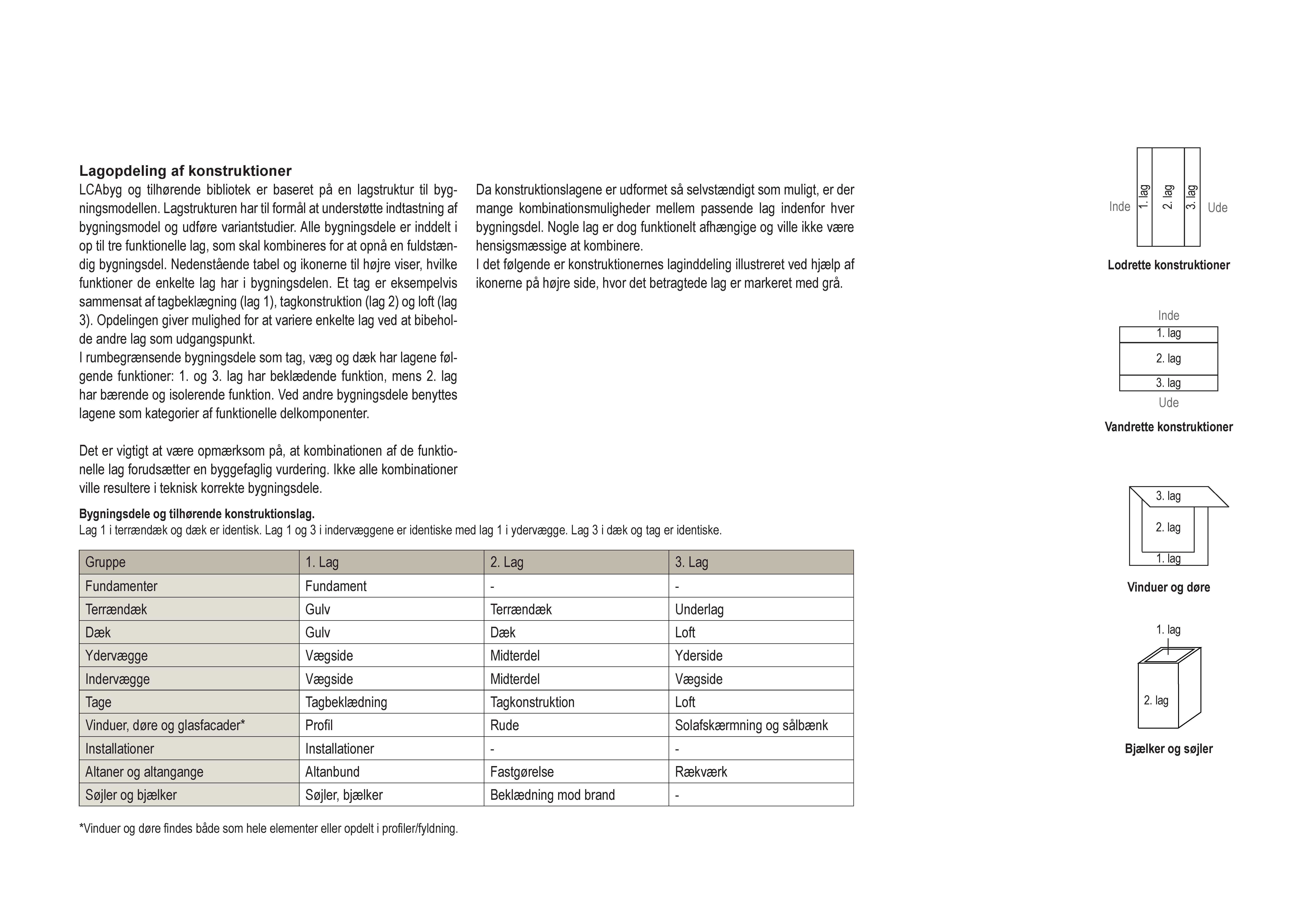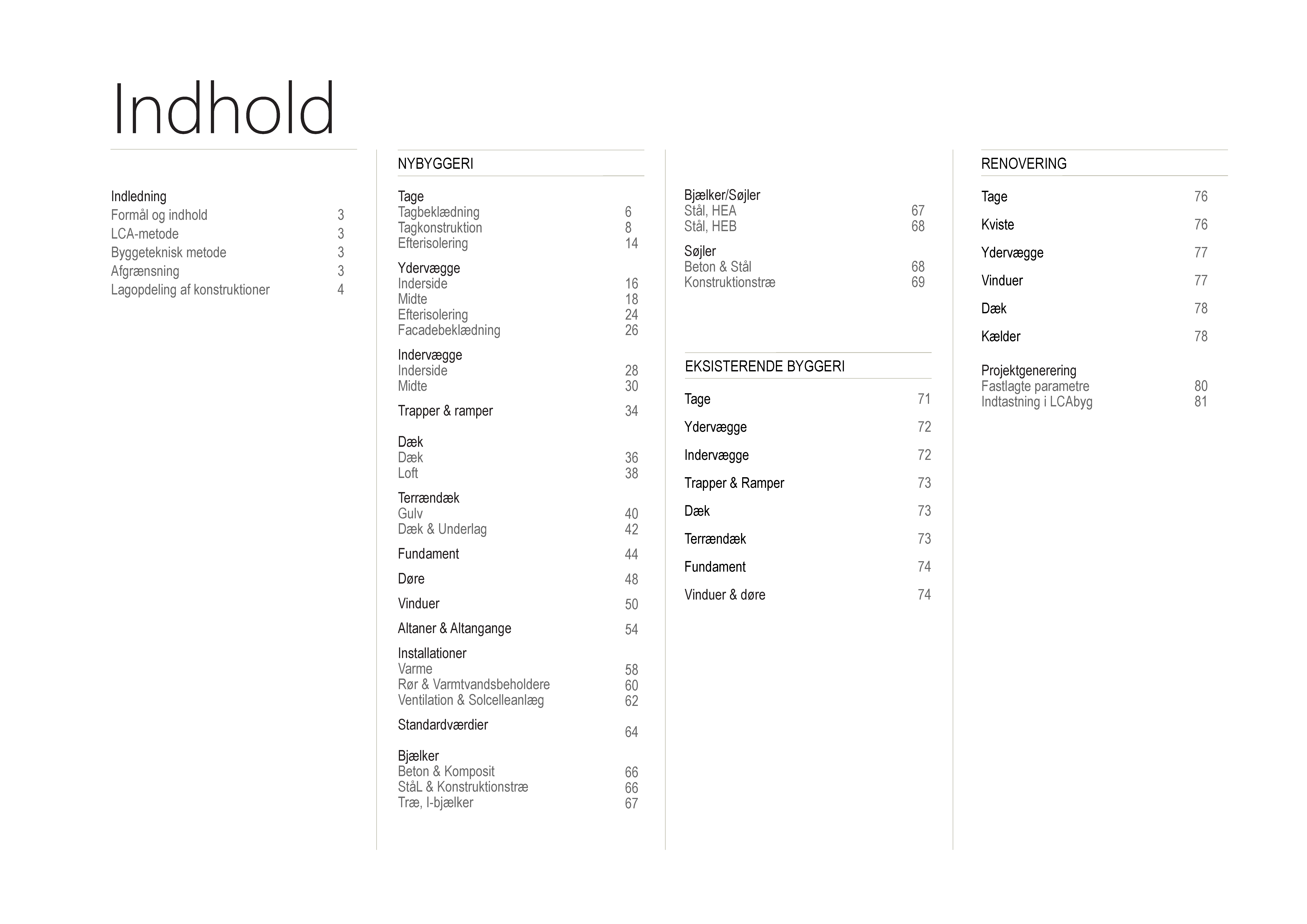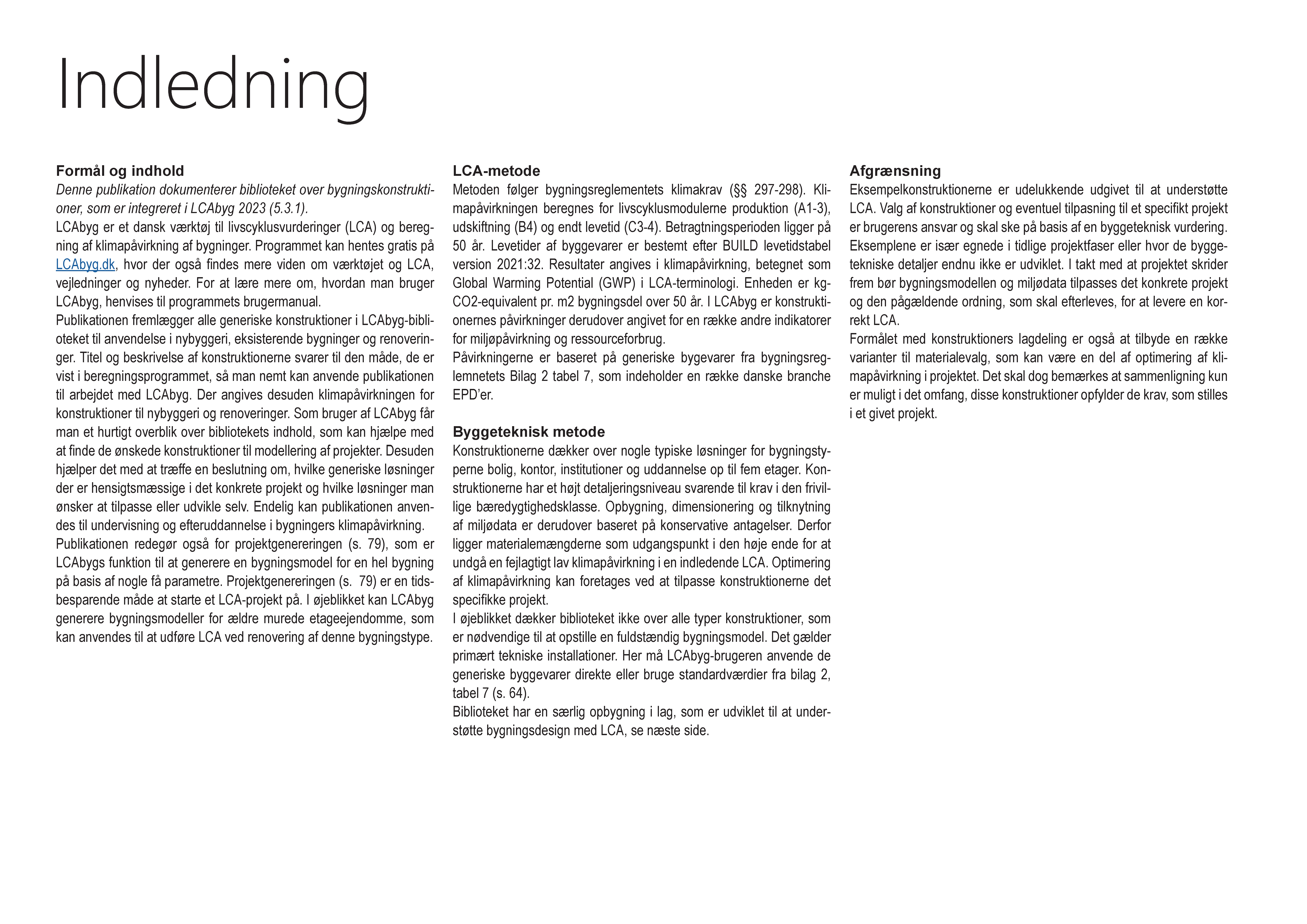 Publikationen fremlægger alle generiske konstruktioner i LCAbyg-biblioteket til anvendelse i nybyggeri, eksisterende bygninger og renoveringer. Titel og beskrivelse af konstruktionerne svarer til den måde, de er vist i beregningsprogrammet, så man nemt kan anvende publikationen til arbejdet med LCAbyg. Der angives desuden klimapåvirkningen for konstruktioner til nybyggeri og renoveringer. Som bruger af LCAbyg får man et hurtigt overblik over bibliotekets indhold, som kan hjælpe med at finde de ønskede konstruktioner til modellering af projekter. Desuden hjælper det med at træffe en beslutning om, hvilke generiske løsninger der er hensigsmæssige i det konkrete projekt og hvilke løsninger man ønsker at tilpasse eller udvikle selv. Endelig kan publikationen anvendes til undervisning og efteruddannelse i bygningers klimapåvirkning. Publikationen redegør også for caseindgangen, som er LCAbygs funktion til at generere en bygningsmodel for en hel bygning på basis af nogle få parametre. Caseindgangen er en tidsbesparende måde at starte et LCA-projekt på. I øjeblikket kan LCAbyg generere bygningsmodeller for ældre murede etageejendomme, som kan anvendes til at udføre LCA ved renovering af denne bygningstype.