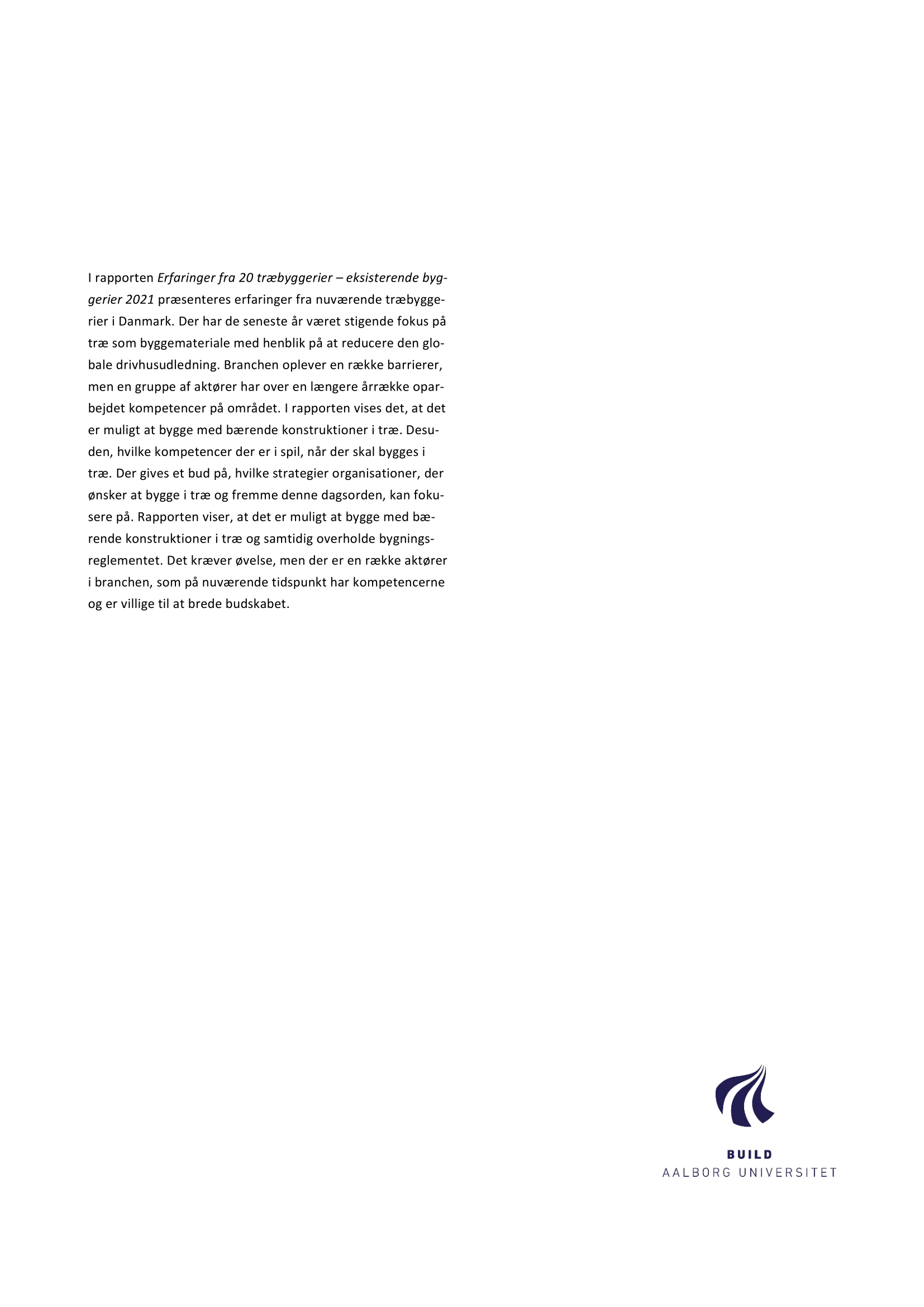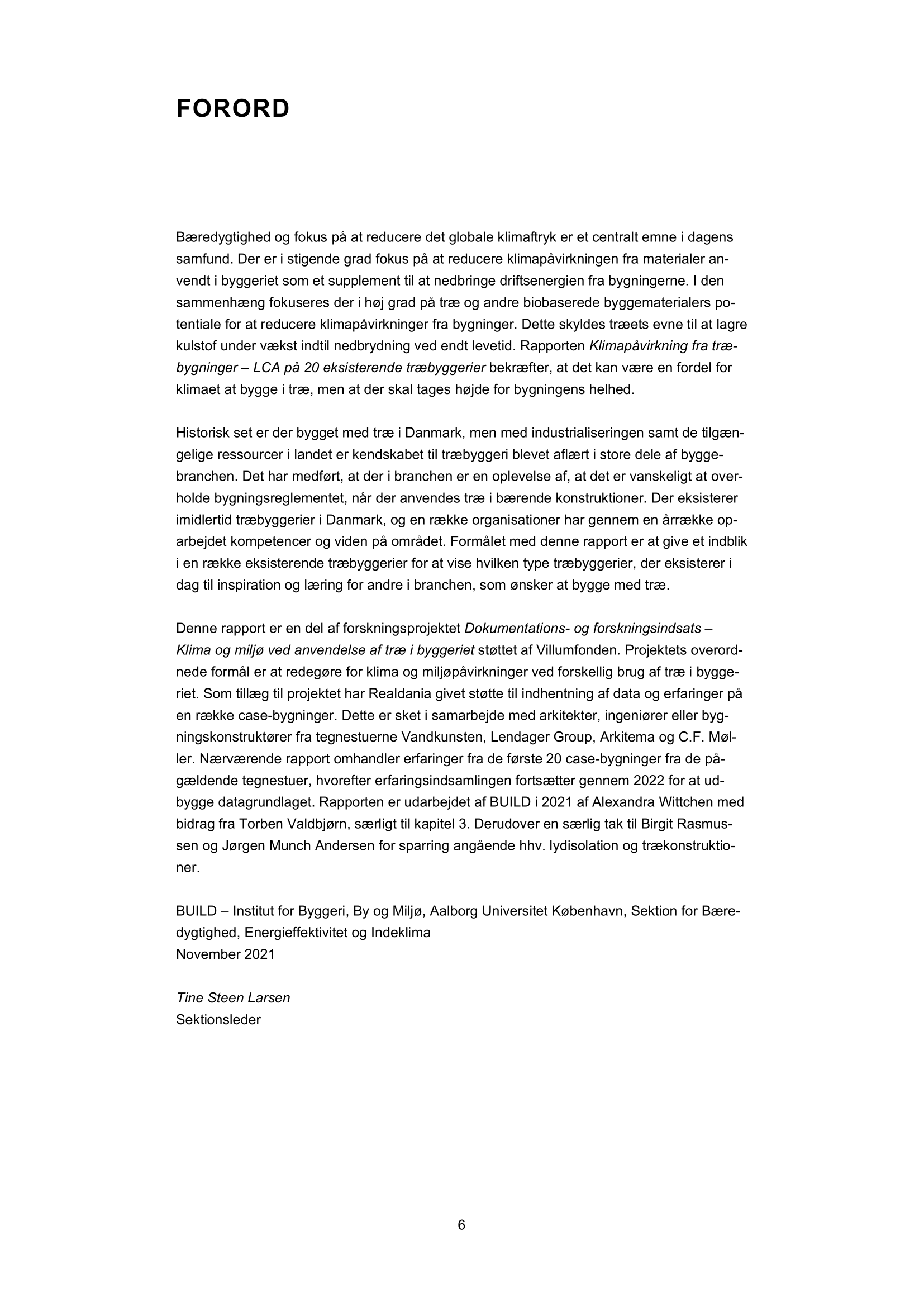 Bæredygtighed og fokus på at reducere det globale klimaaftryk er et centralt emne i dagens samfund. Der er i stigende grad fokus på at reducere klimapåvirkningen fra materialer anvendt i byggeriet som et supplement til at nedbringe driftsenergien fra bygningerne. I den sammenhæng fokuseres der i høj grad på træ og andre biobaserede byggematerialers potentiale for at reducere klimapåvirkninger fra bygninger. Dette skyldes træets evne til at lagre kulstof under vækst indtil nedbrydning ved endt levetid. Rapporten Klimapåvirkning fra træbygninger – LCA på 20 eksisterende træbyggerier bekræfter, at det kan være en fordel for klimaet at bygge i træ, men at der skal tages højde for bygningens helhed.