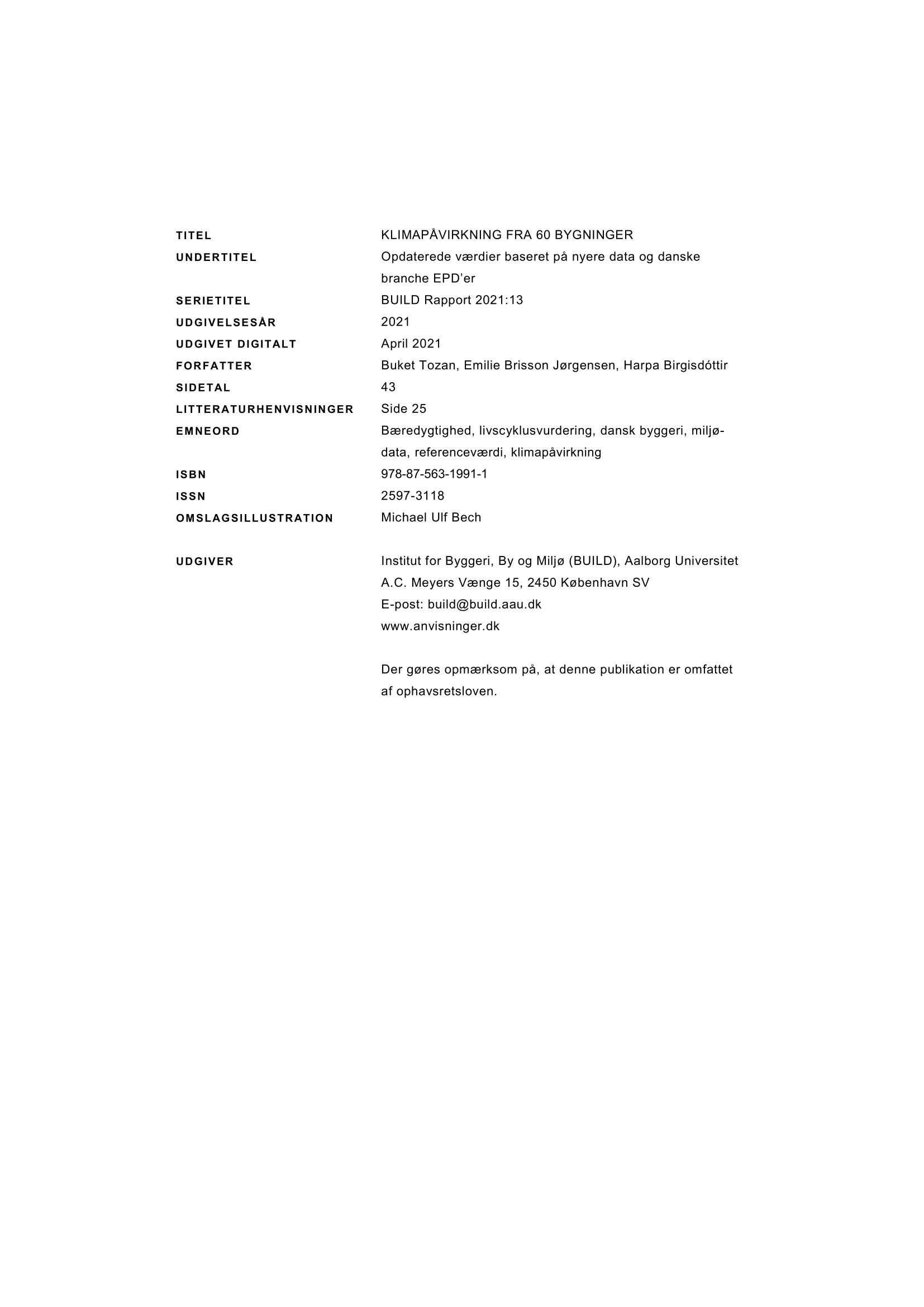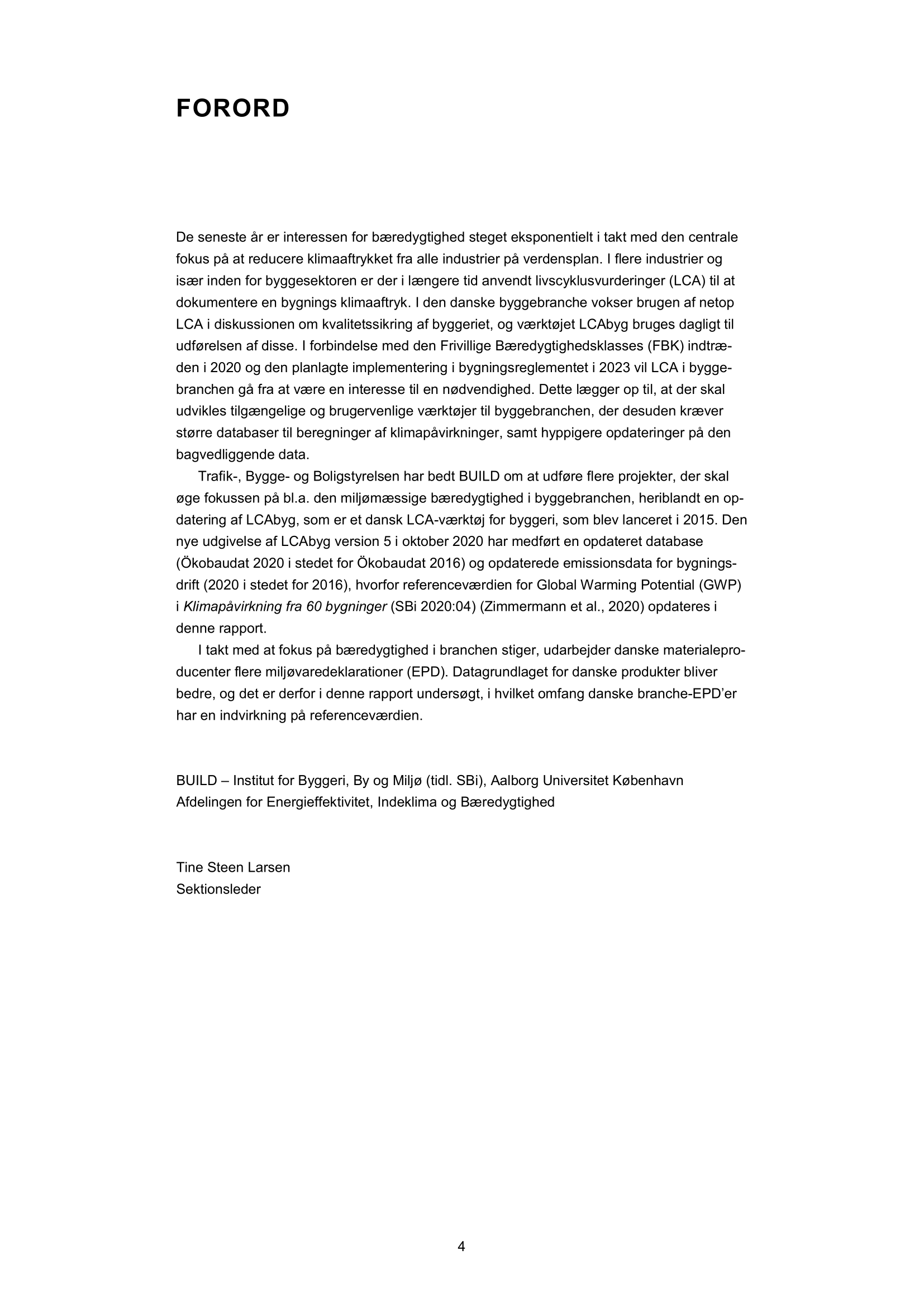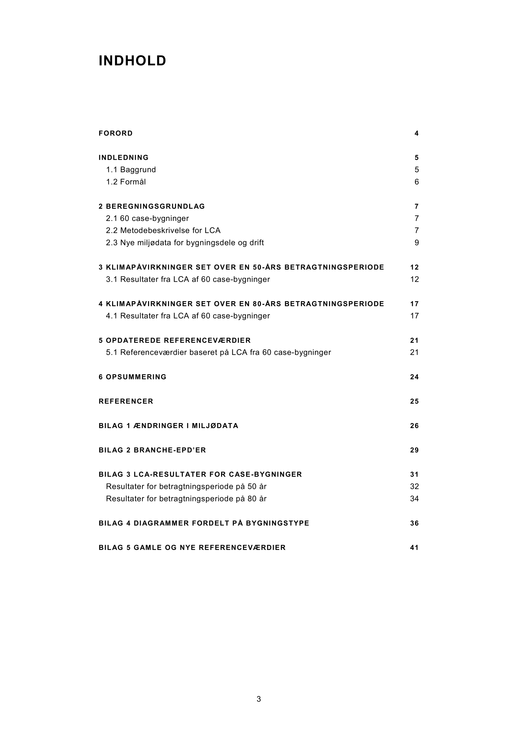 Opdaterede værdier baseret på nyere data og danske branche EPD’er opdateres referenceværdier, der blev udformet i forbindelse med rapporten Klimapåvirkning fra 60 bygninger (SBi 2020:04). Fokusset på at dokumentere og måle klimapåvirkninger fra bygninger stiger, og flere livscyklusvurderinger på bygninger udføres i den danske byggebranche. Denne udvikling nødvendiggør opdateringer af data benyttet til udregning af klimapåvirkninger. I forbindelse med udgivelsen af LCAbyg 5, de nye miljødata i Ökobaudat 2020 og danske branche-EPD’er, opdaterer denne rapport de etablerede referenceværdier idet referenceværdierne beregnes i LCAbyg 5 ved brug af nye miljødata.