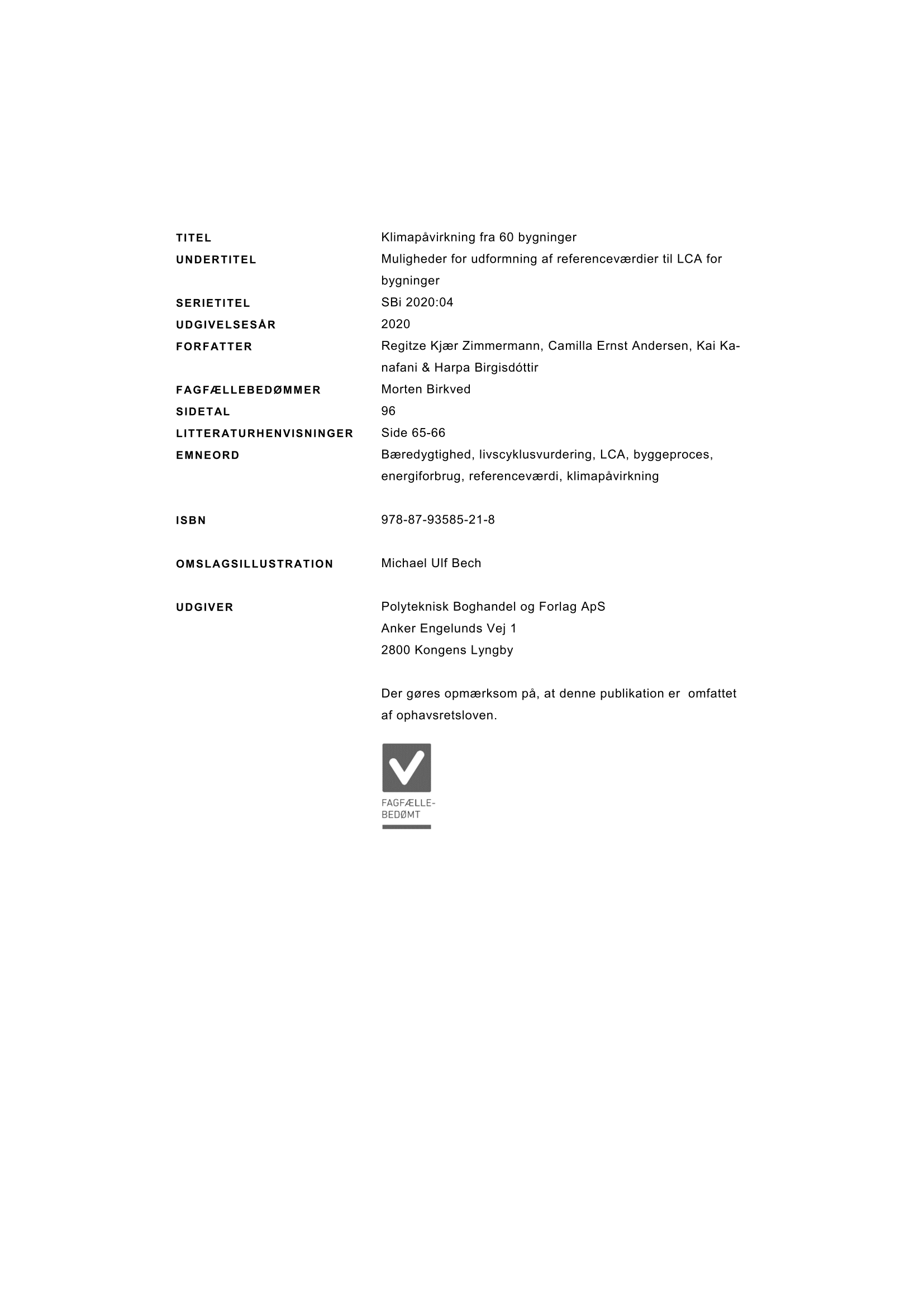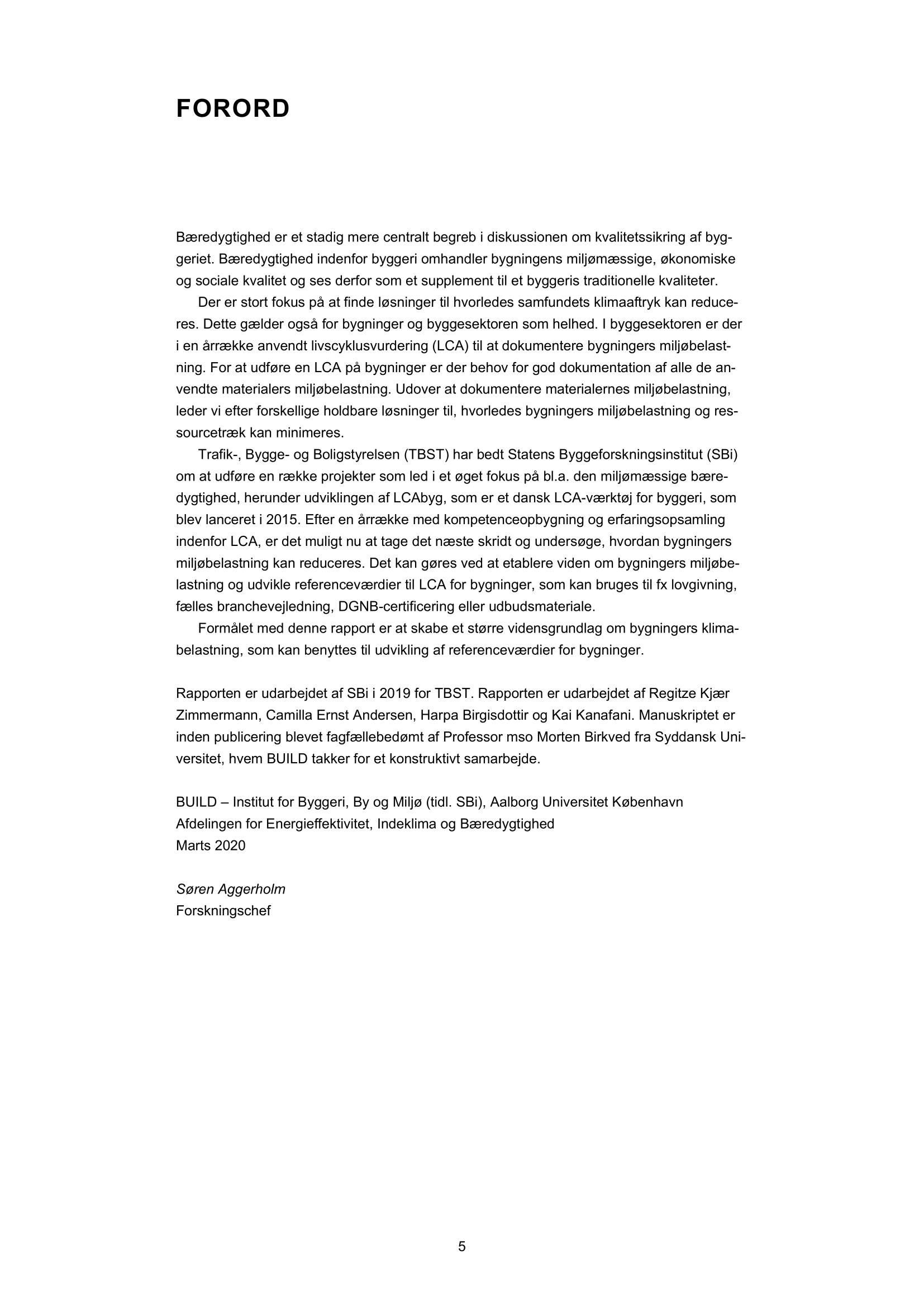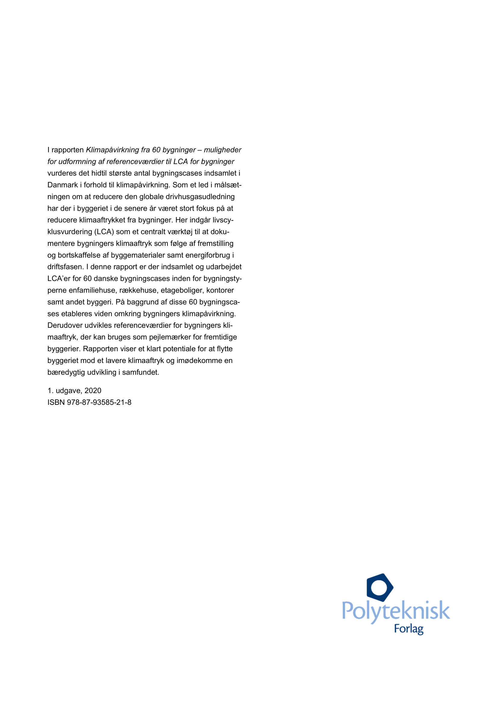 I rapporten Klimapåvirkning fra 60 bygninger – muligheder for udformning af referenceværdier til LCA for bygninger vurderes det hidtil største antal bygningscases indsamlet i Danmark i forhold til klimapåvirkning. Som et led i målsætningen om at reducere den globale drivhusgasudledning har der i byggeriet i de senere år været stort fokus på at reducere klimaaftrykket fra bygninger. Her indgår livscyklusvurdering (LCA) som et centralt værktøj til at dokumentere bygningers klimaaftryk som følge af fremstilling og bortskaffelse af byggematerialer samt energiforbrug i driftsfasen. I denne rapport er der indsamlet og udarbejdet LCA’er for 60 danske bygningscases inden for bygningstyperne enfamiliehuse, rækkehuse, etageboliger, kontorer samt andet byggeri. På baggrund af disse 60 bygningscases etableres viden omkring bygningers klimapåvirkning. Derudover udvikles referenceværdier for bygningers klimaaftryk, der kan bruges som pejlemærker for fremtidige byggerier. Rapporten viser et klart potentiale for at flytte byggeriet mod et lavere klimaaftryk og imødekomme en bæredygtig udvikling i samfundet.
